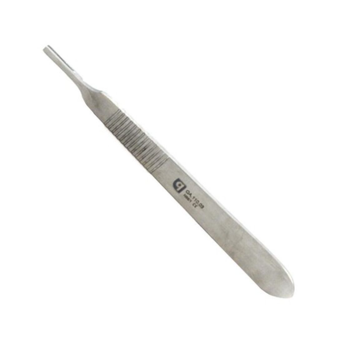 Instrumento cirúrgico odontológico indicado para fixação e manipulação de lâminas de bisturi em procedimentos de diérese e incisões cirúrgicas, garantindo precisão e controle durante cortes em tecidos moles e procedimentos orais menores.