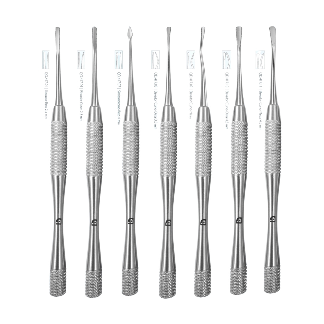 | Os Elevadores Vectis Quinelato foram especialmente desenvolvidos para extrações minimamente traumáticas, com pontas que permitem a preservação dos tecidos e cabos ergonômicos que proporcionam o uso controlado da força. |