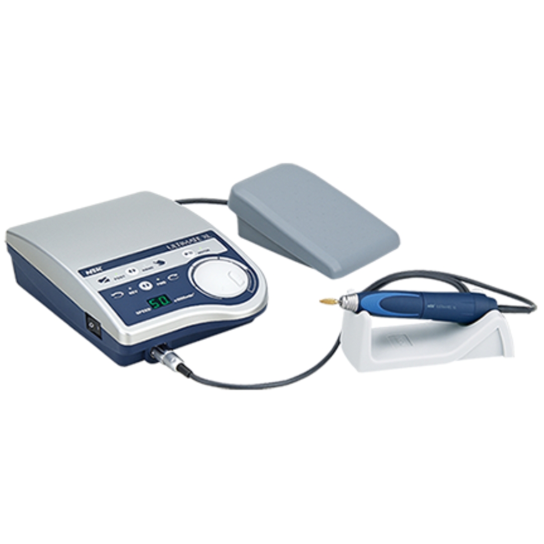 Embalagem com motor de bancada Ultimate, pedal, cabo de força, micromotor com cabo e suporte para micromotor.