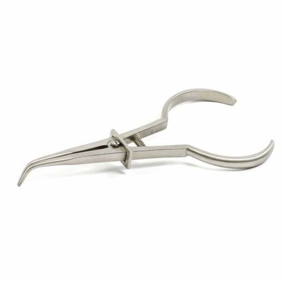 Instrumento odontológico indicado para conduzir e abrir grampos durante procedimentos de isolamento absoluto, facilitando a colocação do grampo no dente com maior precisão e controle clínico.